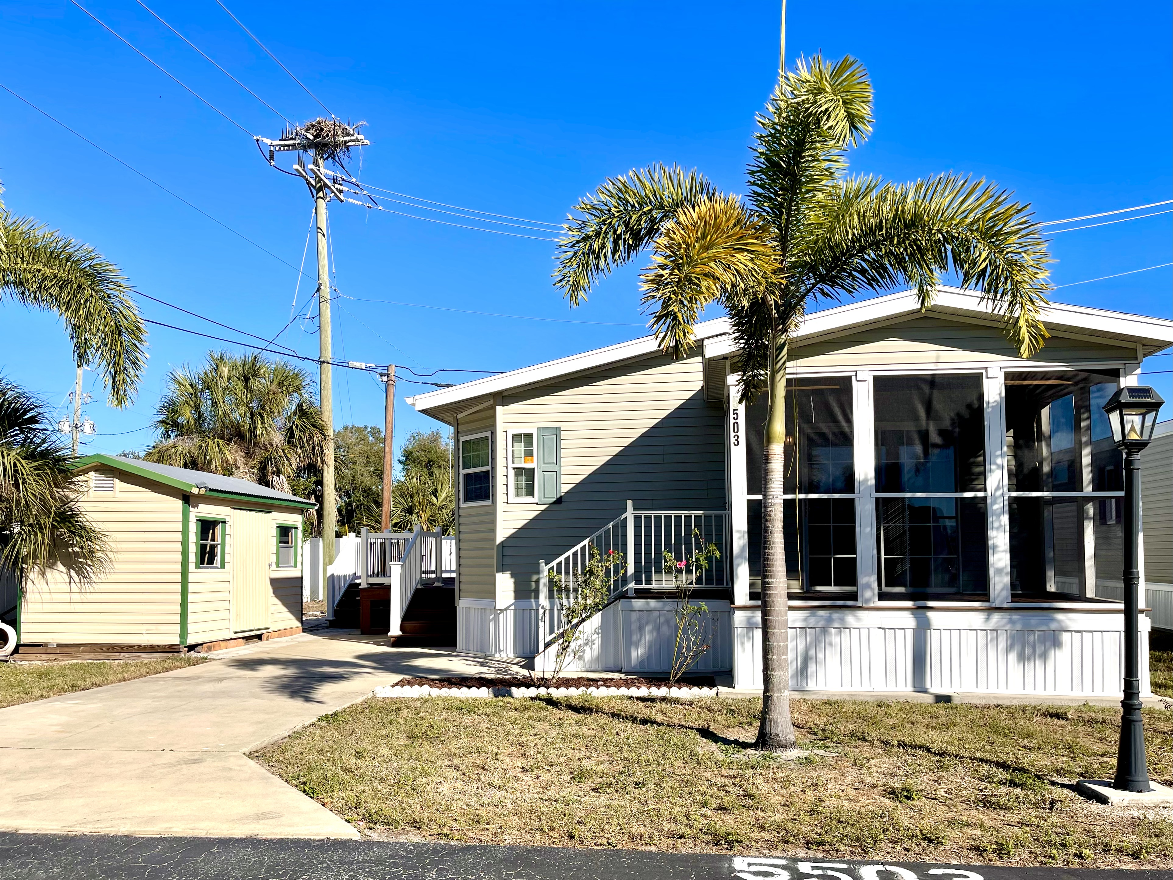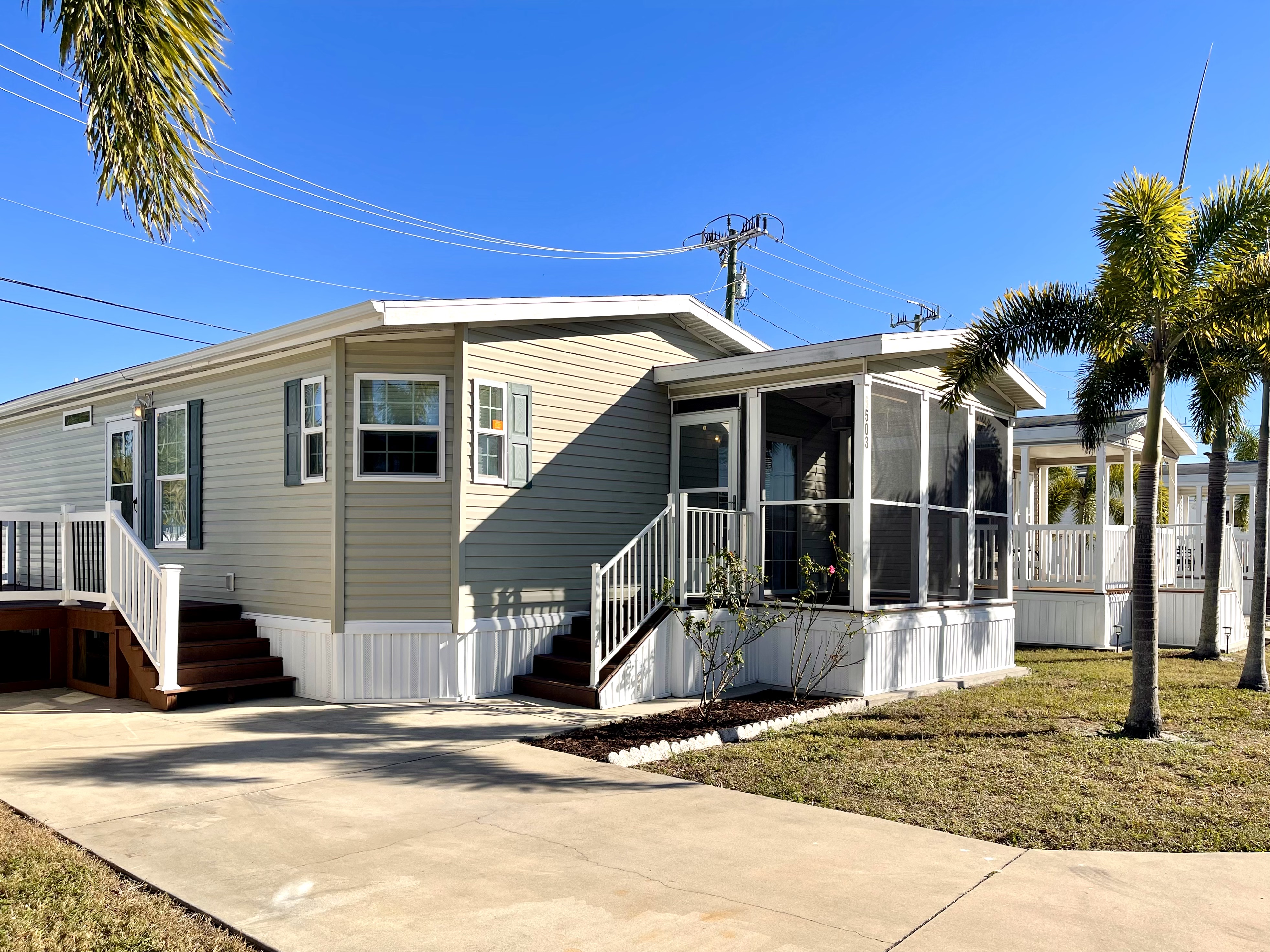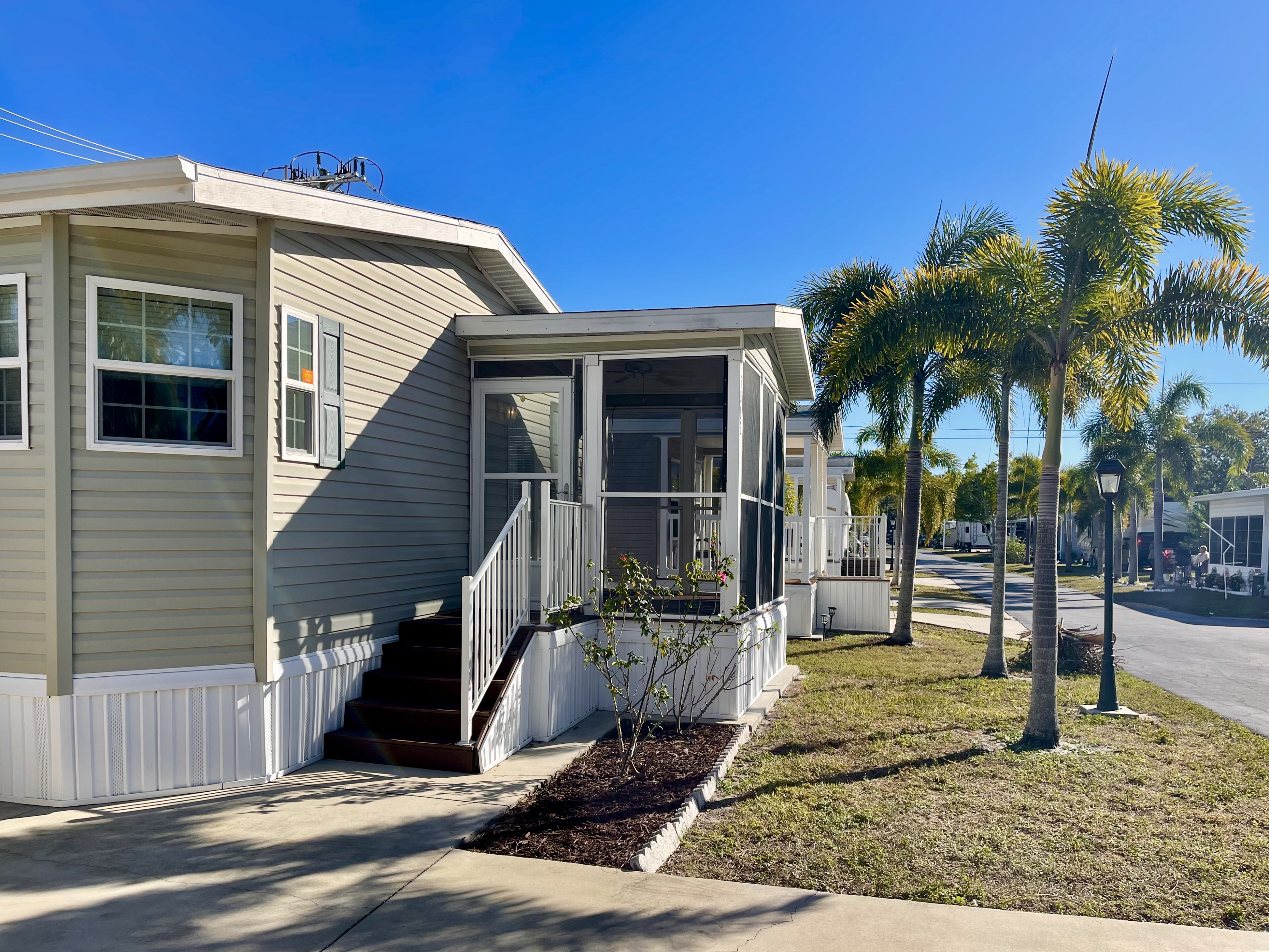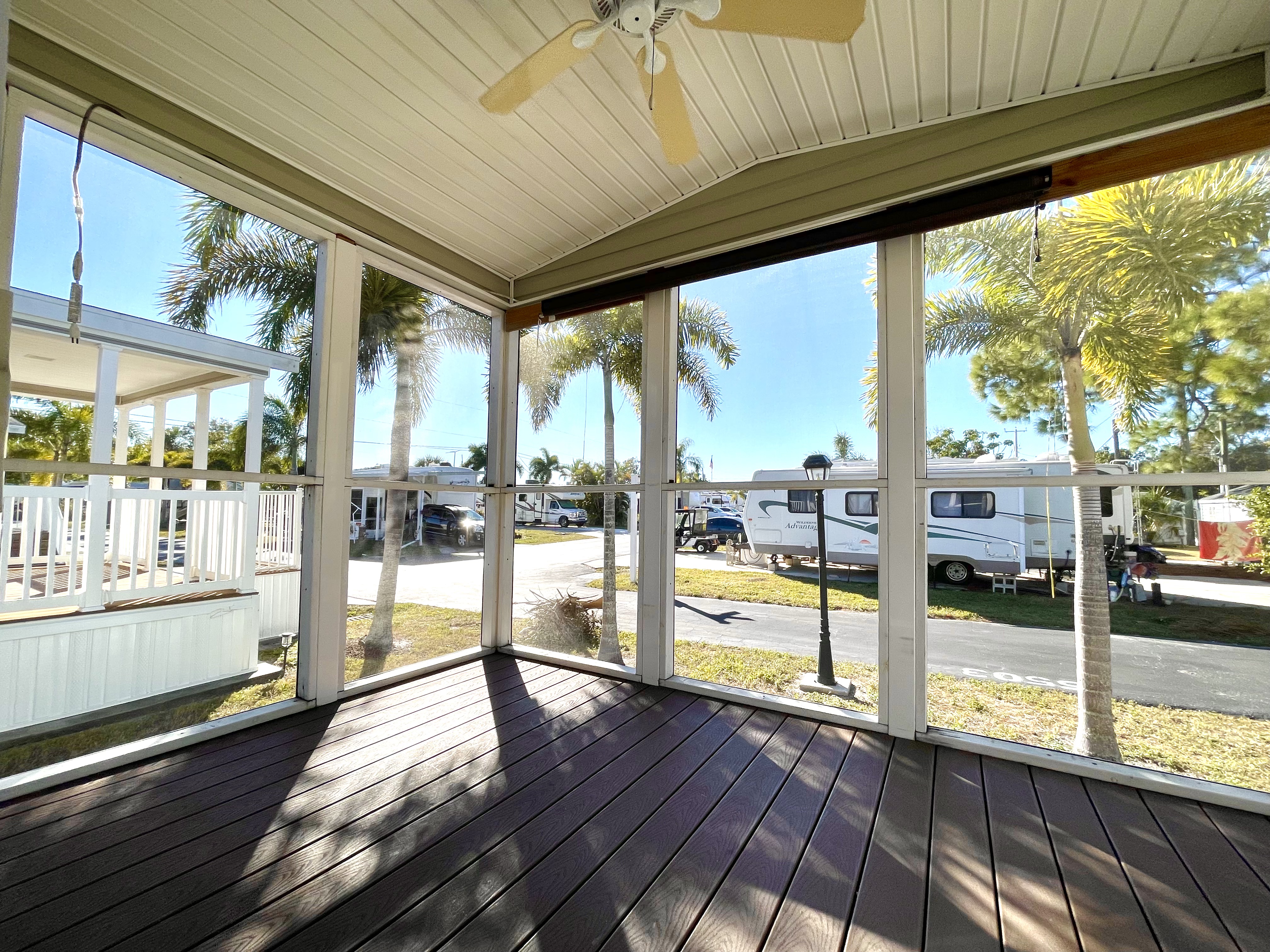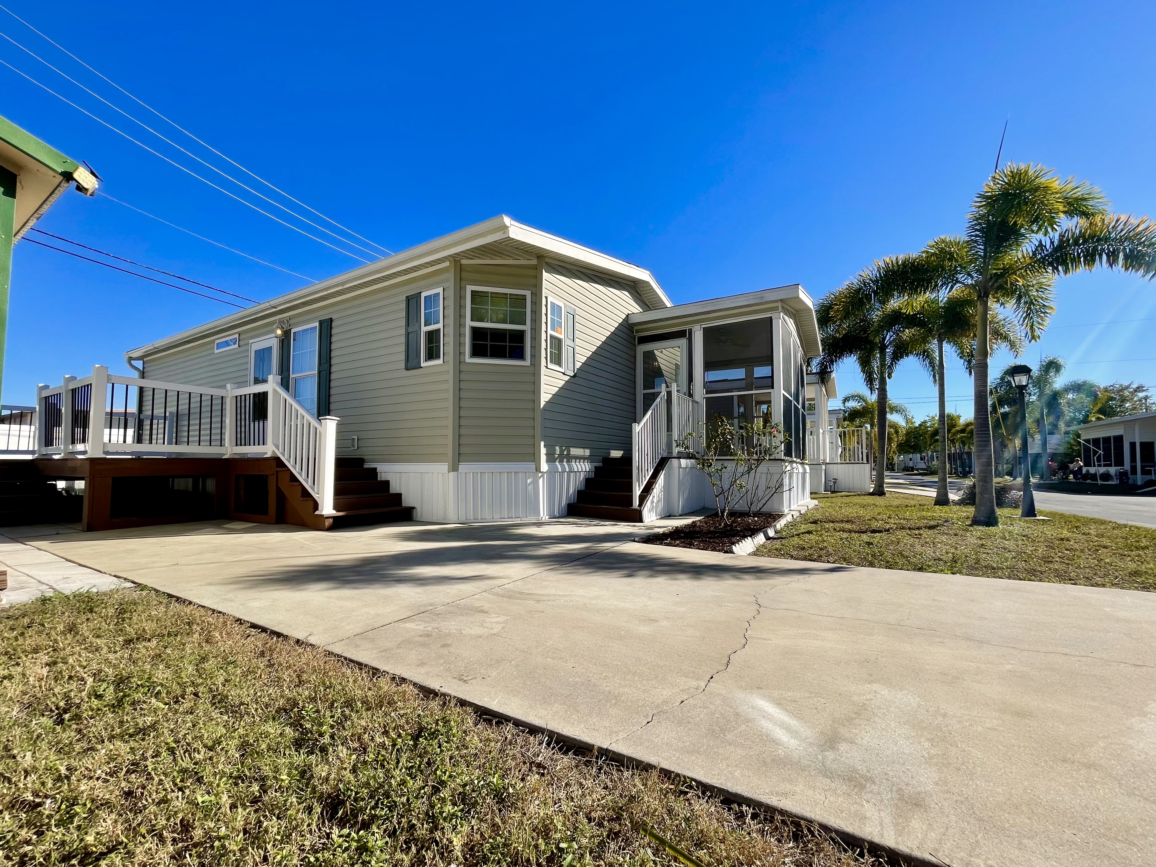 Like-New 2015 Home on Rare Double Corner Lot | Resort-Style Living Near Gulf Beaches Welcome to your private Gulf Coast retreat! This like-new 2015 2BD/2BA 1080 SqFt home is located in a highly desirable all-ages, resort-style community in Bradenton, Florida, just minutes from world-famous Gulf beaches, shopping, dining, and entertainment. Situated on a rare double corner perimeter lot, this home offers exceptional privacy, multiple-car parking, and expansive outdoor living space featuring paver patios, mature palm trees, and lush landscaping. Outdoor living shines with decking on both the front porch (Trex) and side deck, plus an extra storage shed for added convenience. Enjoy morning coffee or sunset cocktails from the screened-in front porch with Gulf Coast Sunset Sky views, complete with a roll-down privacy blind. Inside, the bright open-concept floor plan is highlighted by cathedral vaulted ceilings, luxury vinyl plank flooring throughout, and upscale finishes including sheetrock walls, crown molding, paneled doors, and custom window cornice details. The stylish kitchen boasts white cabinetry, a double-basin sink, abundant storage, and a large island with barstool seating, perfect for entertaining or everyday living. Sliding French doors seamlessly connect the indoor space to the screened porch for effortless Florida indoor-outdoor living. The split-bedroom layout provides comfort and privacy, featuring a guest bathroom with a shower/tub combo and a spacious primary suite with a step-in shower, privacy wall, and pocket door. Additional highlights include a 2024 Centra A/C Unit, Shingled Roof, extra storage shed, and low-maintenance landscaping. This pet-friendly, ALL AGE Community offers true resort-style amenities, including a clubhouse, heated pool, fitness center, pickleball courts, game room, shuffleboard, horseshoes, pavilion, picnic areas, pet walk, and doggie station. Move-in ready, private, and impeccably maintained-this home is ideal as a full-time residence, vacation getaway, or seasonal retreat. Experience the best of Florida Gulf Coast living in one of Bradenton’s most sought-after resort communities. Lot rent for this home is just $824 per month and includes trash/recycling pickup, lawn-care, and amenities! Don’t wait, call today! All listing information is deemed reliable but not guaranteed and should be independently verified through personal inspection by appropriate professionals. Integrity Mobile Home Sales cannot guarantee or warrant the accuracy of this information, measurements, or property condition. Measurements are approximate. Lot rent is subject to change.